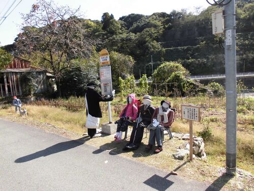 会場の外に出て、三瀬のほうに少し歩いてみます。 国道が右に分かれ、左側にまっすぐ進む細い道、集落の中を通る旧道です。この旧道沿いにもかかしが展示してあります。